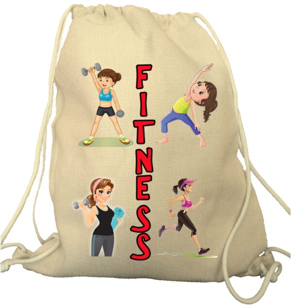 Mochila tipo saco en color beige con cuerdas blancas, ideal para Fitness. Bolsa ideal para llevar al gimnasio. Con imagenes de diferentes ejercicios. Fabricado 100% poliéster de tacto suave e imitación a tela de Rafia. Dimensiones: 34×40 cm