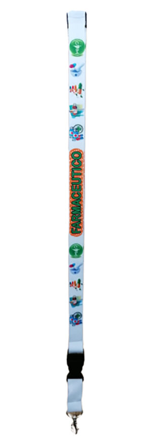 Lanyard de poliéster con mosquetón, hebilla y cierre de seguridad. Texto «FARMACEUTICO». Decorado con logo farmacia, pastillas, jarabe, cruz verde . Ideal para que no se pierdan las tijeras, el bolígrafo, etc. También para llevar la acreditación. Cierre de plástico delantero con sistema de clic de rápida extracción para poder separar del lanyard lo que necesites usar. Si te lo dejas en algún sitio siempre notaras que te falta algo. Con cierre de seguridad en la nuca. Se desabrocha automáticamente con un tirón para evitar posibles enganchones en el cuello. Dimensiones del lanyard:2cm x 55cm