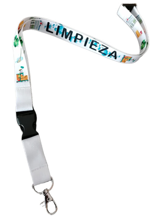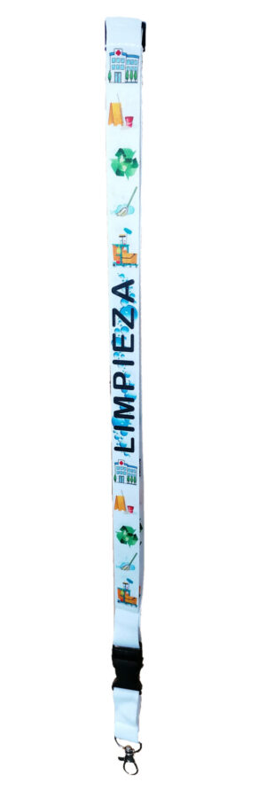 Lanyard de poliéster con mosquetón, hebilla y cierre de seguridad. Texto «LIMPIEZA» en ambos lados, especifico para trabajador de hospital. Decorado con hospital, carro limpieza, fregona, reciclaje y burbujas. Ideal para que no se pierdan las tijeras, el bolígrafo, etc. También para llevar la acreditación. Cierre de plástico delantero con sistema de clic de rápida extracción para poder separar del lanyard lo que necesites usar. Si te lo dejas en algún sitio siempre notaras que te falta algo. Con cierre de seguridad en la nuca. Se desabrocha automáticamente con un tirón para evitar posibles enganchones en el cuello. Dimensiones del lanyard:2cm x 55cm